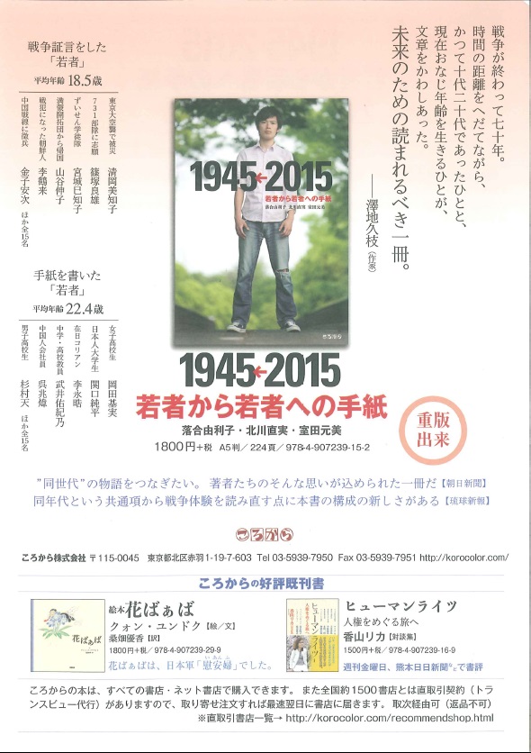 様々な体験者の証言を綴った本「1945←2015 若者から若者への手紙」を、英訳して、電子書籍にして世界中に届けようという2020プロジェクトに賛同したいと思います。