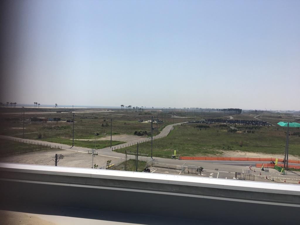 荒浜小学校の屋上から見渡す風景は、新しい道が広がり、