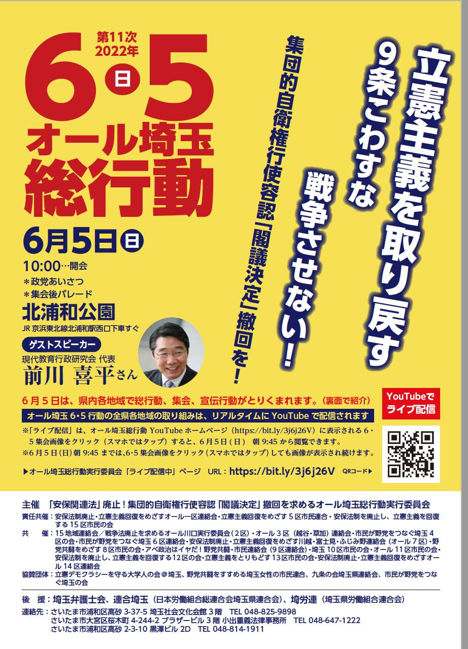 6.5オール埼玉総行動 2024 5/08 イベント 2022年6月2日2024年5月8日 オール埼玉総行動実行委員会ホームページ 9条壊すな 戦争させない 立憲主義を取り戻す 集団的自衛権行使容認「閣議決定」撤回を! オール埼玉総行動の原点は ブレずにここにあります。 埼玉県各地で同時に取り組みがあります。 お近くの会場で是非ご参加を!! イベント ウクライナ侵略と日本の核共有 「投票に行こう」