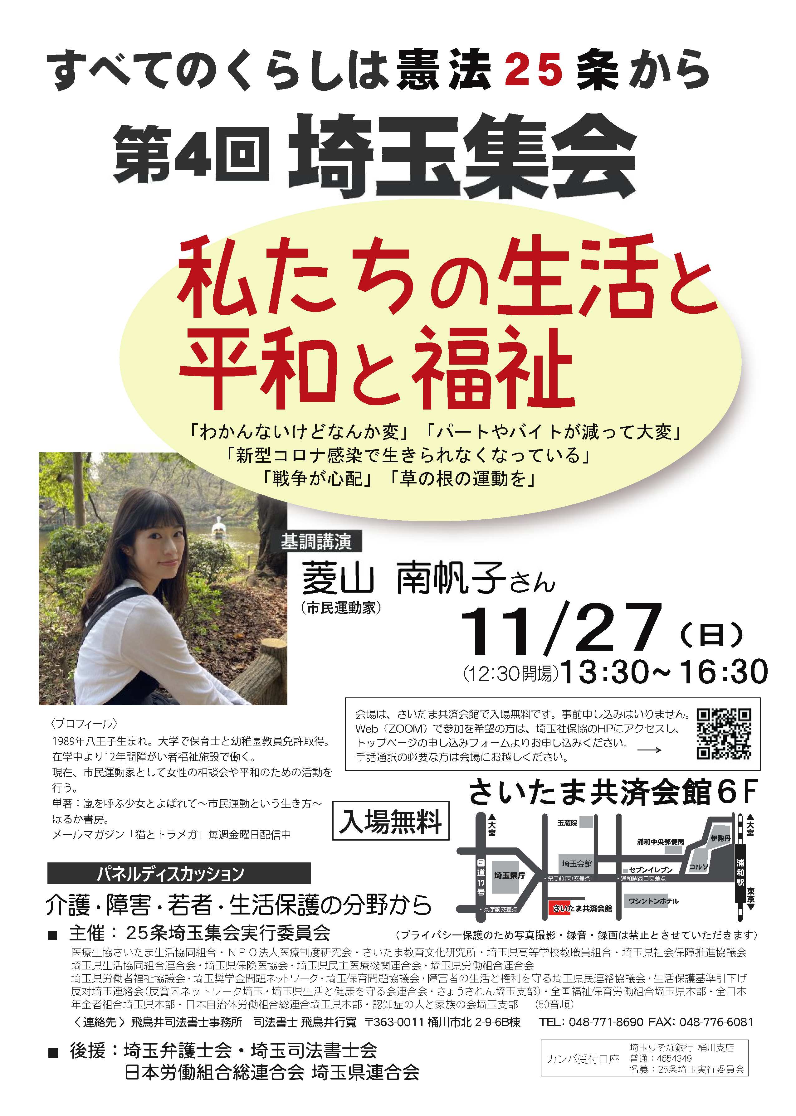 すべてのくらしは憲法25条から 2024 5/08 イベント 2022年11月19日2024年5月8日 すべてのくらしは憲法25条から 第4回 埼玉集会 日時 2022年11月27日(日) 13:30~16:30(12:30開場) 場所 さいたま共済会館 6階 私たちの生活と平和と福祉 基調講演は 市民運動家の菱山南帆子さん パネルディスカッション 毎回、当事者の方々の生の声で語られる状況に心揺さぶられます。 是非ご参加ください。 第4回25条集会チラシ 2022年11月27日_compressed イベント #安保法制違憲訴訟 #小西洋之参議院議員 『旧統一教会被害者救済法案』