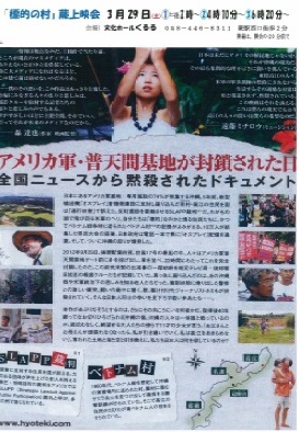 ニュースを見ていれば世界中の出来事がわかると信じていたけれど・・・知るべきことをニュースは報道しない。あまりにも悔しくて涙が出た。東村高江地区を囲むように米軍ヘリポートが作られてしまった。上映会場から、沖縄に、とんで行きたかった。飛んでいったら、骨埋めちゃいそうな気がした。それは悔しさや怒りだけでなく、高江地区の住民がなんだか同じご町内の身近な隣人に思えてしまう、そんな親しみをもってしまう映像でもあったからだ。